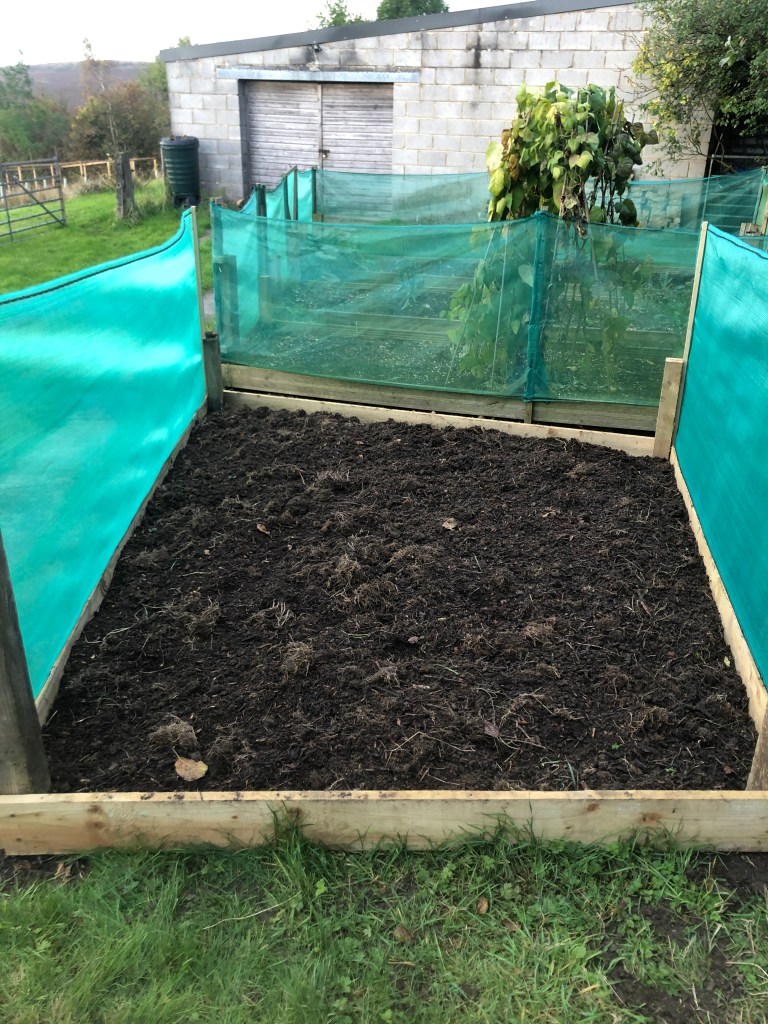 But there was room for a new bed, set at right angles in the corner where the path from the barn starts to curve up hill towards the house, past the bramble patch and the Scots pine. For the past few years the space has been home to the piles of wood we have chopped and pruned while they awaited chipping. This year, after some early summer chipping, it was staked, holes were dug for fence posts, the turfs lifted, a path between it and the next bed over excavated, with the soil dumped on the bed itself.