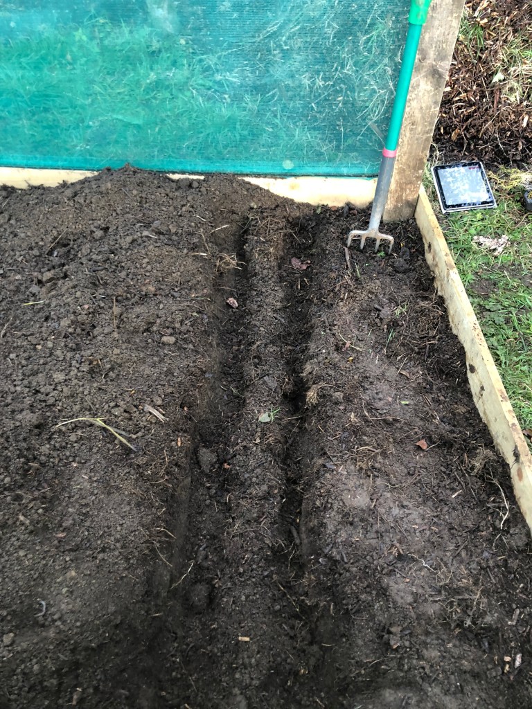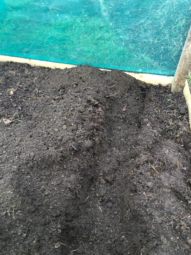 In the end, the final stages were fitted in to snatched hours over several weeks. Transferring a bin-and-a-half of well-rotted compost took place one afternoon when the thought of more emails on a sunny day proved too much. Matt finished the digging in when I had to run off to take the small garden assistant to a riding lesson. But finally it was done, at least the bed for planting; Matt still had some windbreaks and gates to add to incorporate it into the veg patch fully.